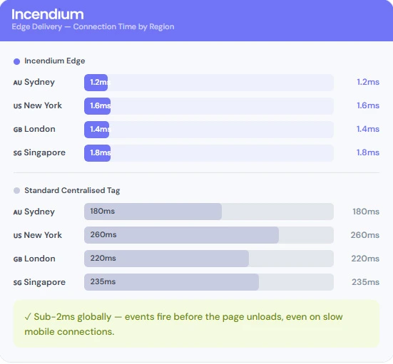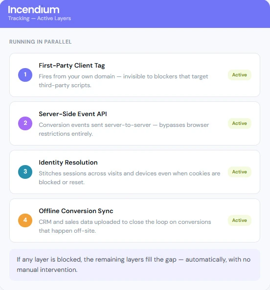 Incendium uses resilient, first-party data to bypass iOS 17 and browser blockers—restoring the tracking fidelity you need for perfect multi-touch attribution and optimized ad performance.